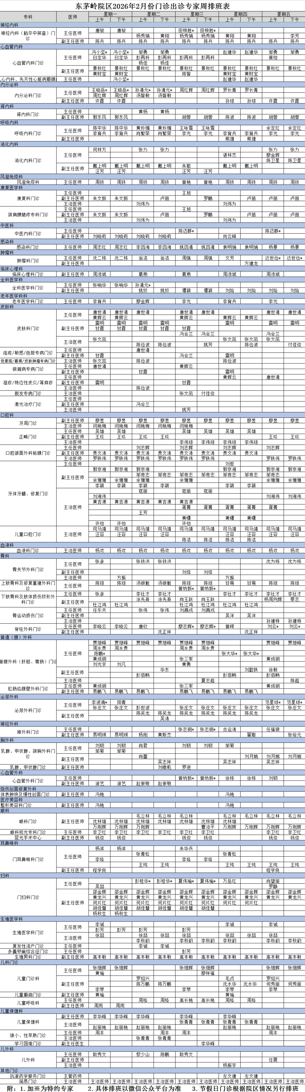 2026年2月东茅岭院区排班表