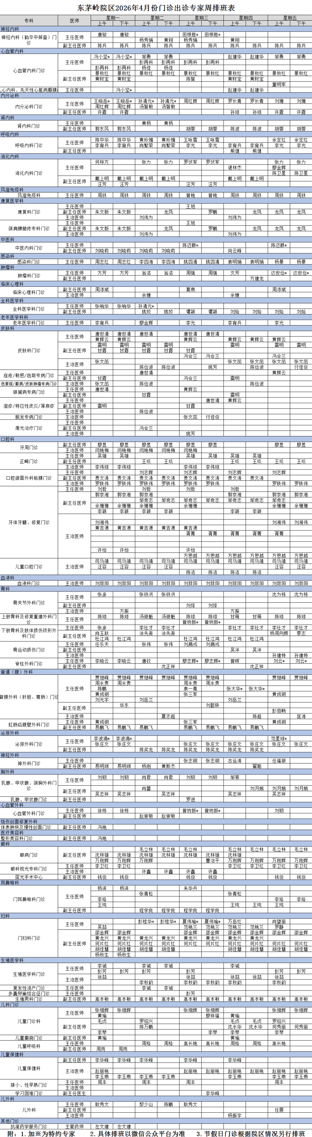 2026年4月东茅岭院区排班表