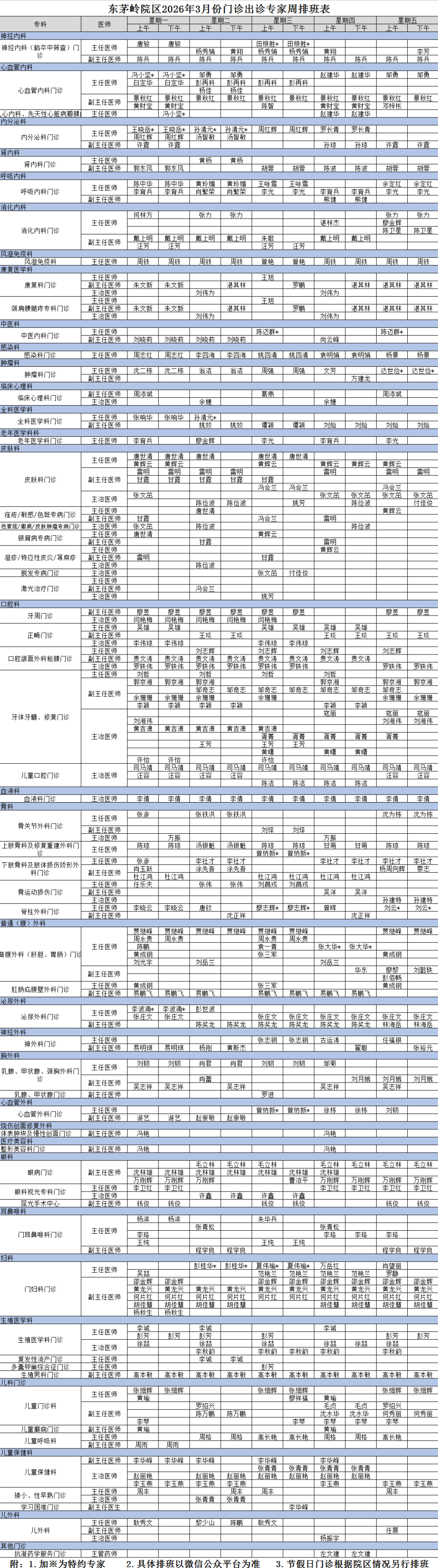2026年3月东茅岭院区排班表